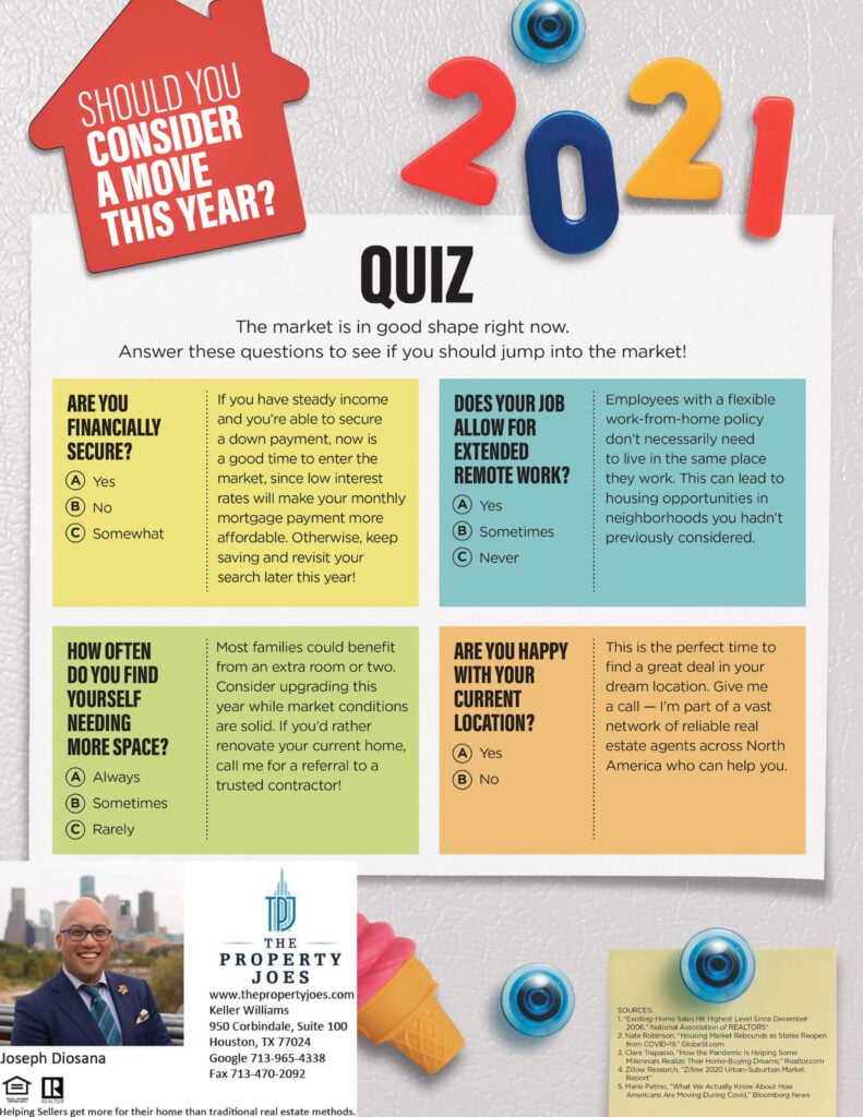 If the economic uncertainty of 2020 had you concerned, I’m here to bring some peace-of-mind for 2021 when it comes to the housing market. The information I’m sending this month provides a well-rounded snapshot of the real estate market today, while noting a few trends to watch as the year unfolds. I’m also including a short quiz to help you figure out if now is the right time for your family to make a move, especially if your needs have changed since last year.