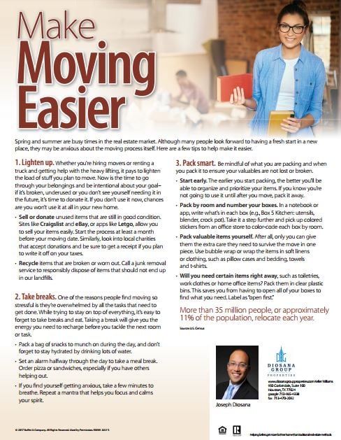 This month, I’m sending information intended to reduce the stress of your next move. Page one outlines three tips to help your move go more smoothly. Moving is tough enough, but with the addition of children and pets, stress may increase exponentially. For those moving with little ones and furry friends in tow, page two offers insight to help keep every member of your family happy.