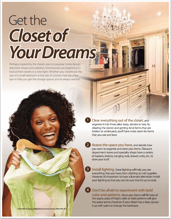 Last month, I sent information intended to help you organize a garage sale to sell the items that have been cluttering up your closets. This month I’m sending information that will help you get motivated to stay organized and design the closet of your dreams. These eight tips will help you think outside of the box and work with what you have to create storage spaces that not only fit your needs, but improve the look and feel of your home as well.