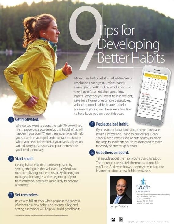 Good habits help us achieve our goals. To help you stay on track to reach the goals you set for 2016, I’m sending information that offers tips for developing better habits. These nine tips will make it easier to incorporate a new habit into your daily routine. Whether your goal is to get healthier or buy a home, these tips are sure to help you rethink your habits and adopt new ones. Since habits take time to develop, it’s important to remain patient and, of course, never give up.