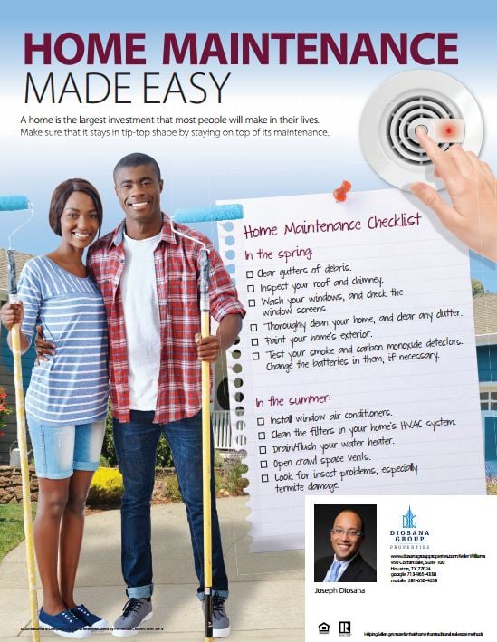 This month, I’m sending along information that will take the mystery out of home maintenance. The information includes a home maintenance checklist, separated by season, so that you’ll always stay on top of things. If you’d like a referral to a reputable home repair service or handyman in our area, give me a call! I’m more than happy to connect you with someone in my professional network.