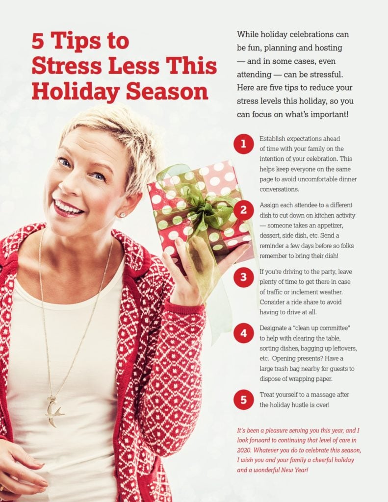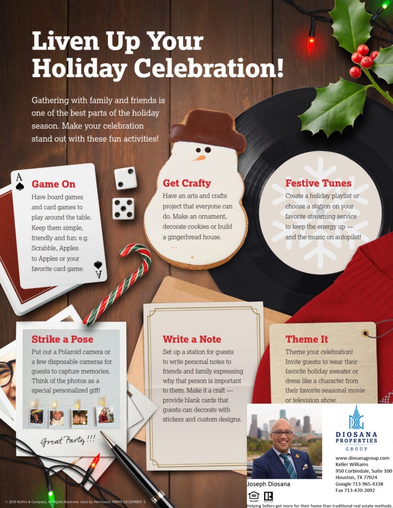 This month, I’m sending you a few ways to liven up any holiday celebration! Get ideas for games, party activities and entertainment to keep guests happy. If you are the guest this year, try taking some of these ideas to the party instead! Additionally, I’m sharing tips we can all use to help us stress less this season and focus on what truly matters.