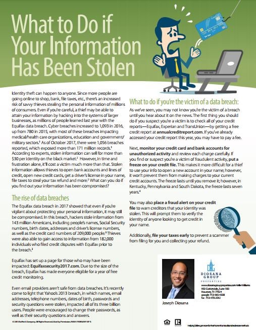 This month, I’m digging deeper into the topic of identity theft, specifically discussing the rise of data breaches. Sometimes, despite your best efforts to protect your identity, you may still be compromised—as the 143 million people impacted by the Equifax data breach learned. Page one outlines what to do if you learn you’re the victim of a data breach, from monitoring your credit reports and accounts to placing fraud alerts and freezes on your credit file to prevent thieves from using what was stolen. Page two outlines the specific steps to take if your banking and credit card information or driver’s license information has been stolen.