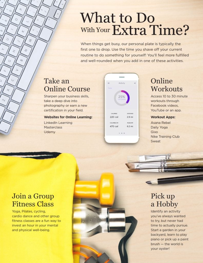 How many times have you found yourself wishing for a few extra hours in the day? Sometimes it feels like there just isn’t enough time to get it all done. When this happens, our health is typically the first thing to take a back seat — then several others often follow suit.