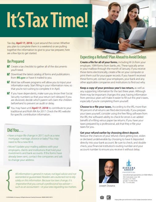 The information I’m sending this month is intended to prepare you for tax time. Page one provides a list of financial details you may need to gather ahead of time to make the process easier, as well as some tips to help you get your refund faster. Page two outlines steps to take to help you protect your identity from thieves who wish to gain access to your information.