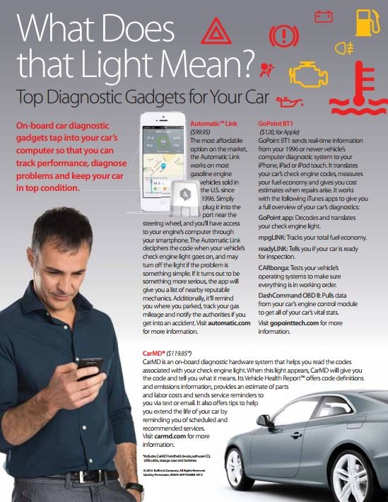 This month I’m sending information about a few of these gadgets, which plug into the port located near your car’s steering wheel. They not only tell you why your “check engine” light went on; they’ll also track your gas mileage and remind you that it’s time to service your car engine. Additionally, page two features five tips to help you keep your vehicle in top shape, even as it racks up more miles.